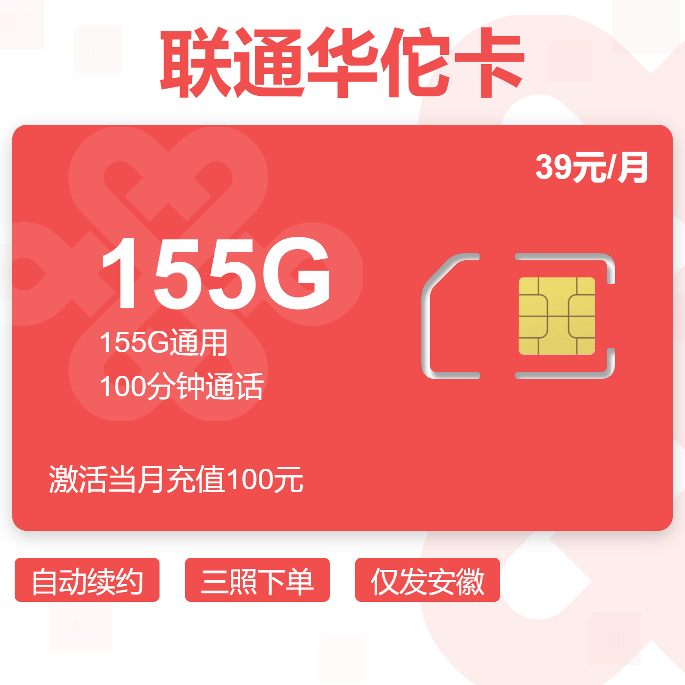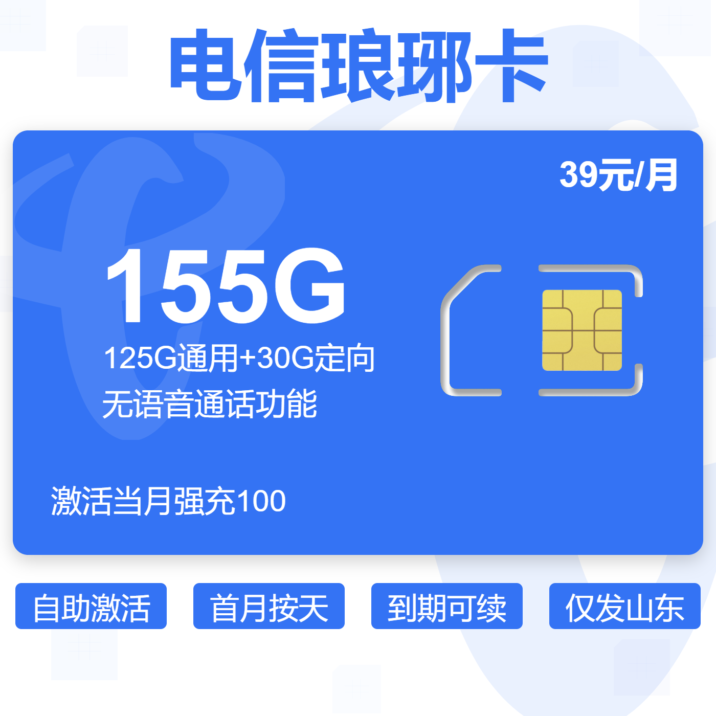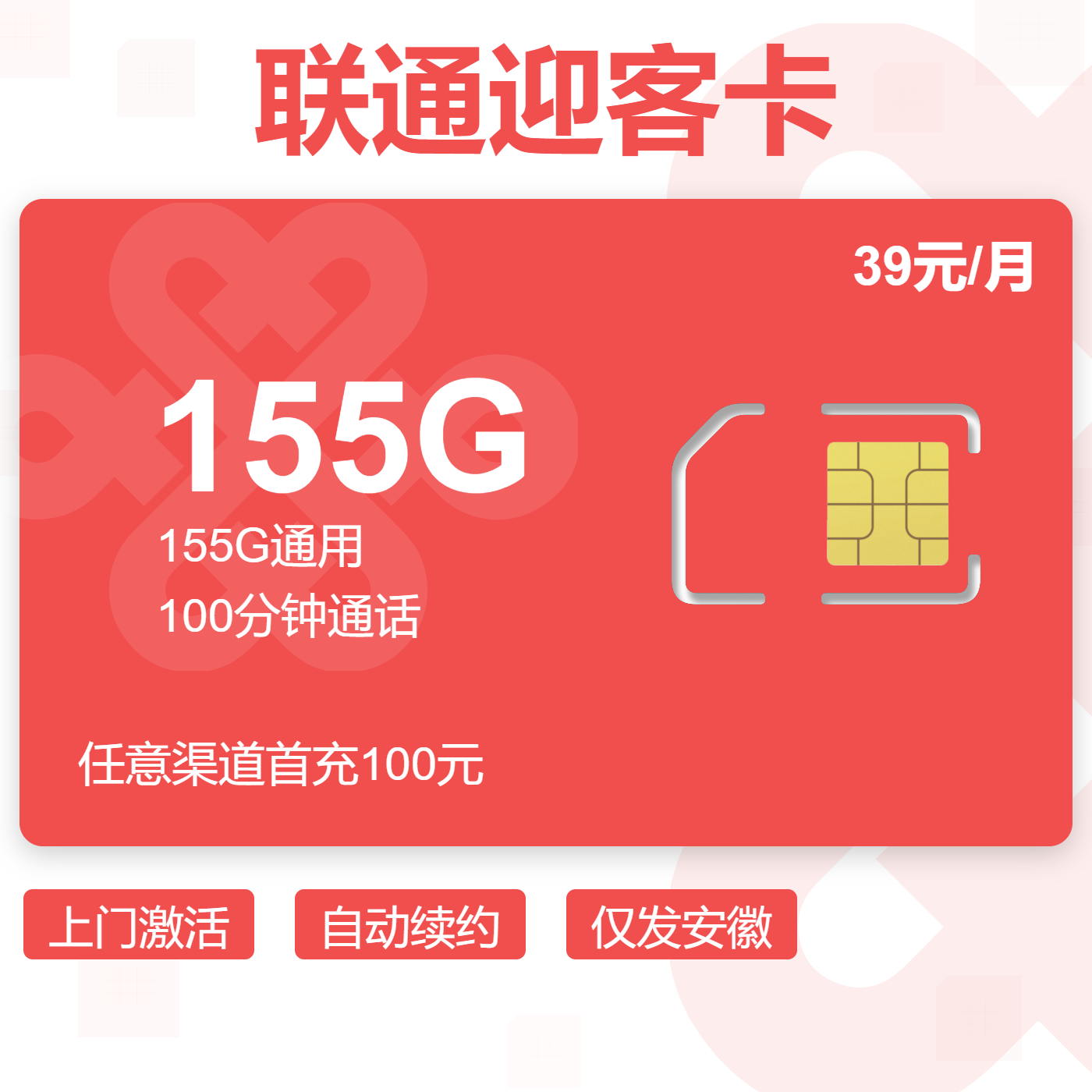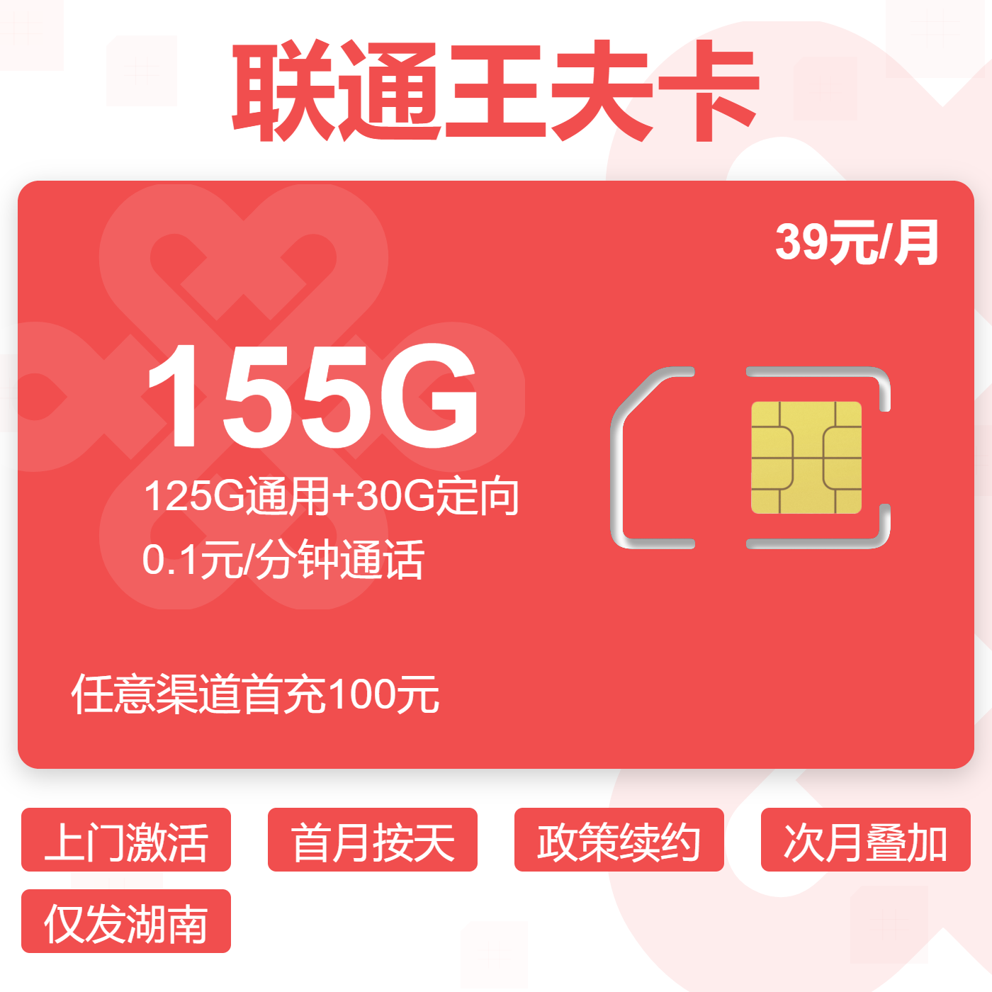 39元155G全国通用流量+100分钟通话(可选靓号)